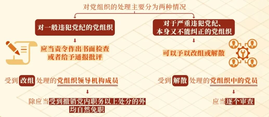 根據(jù)《中國(guó)共產(chǎn)黨紀(jì)律處分條例》規(guī)定,對(duì)黨組織的處理主要分為兩種情況:對(duì)一般違犯黨紀(jì)的黨組織,上級(jí)黨組織應(yīng)當(dāng)責(zé)令其作出書面檢查或者給予通報(bào)批評(píng);對(duì)于嚴(yán)重違犯黨紀(jì)、本身又不能糾正的黨組織,上一級(jí)黨的委員會(huì)在查明核實(shí)后,根據(jù)情節(jié)的嚴(yán)重程度,可以予以改組或解散。