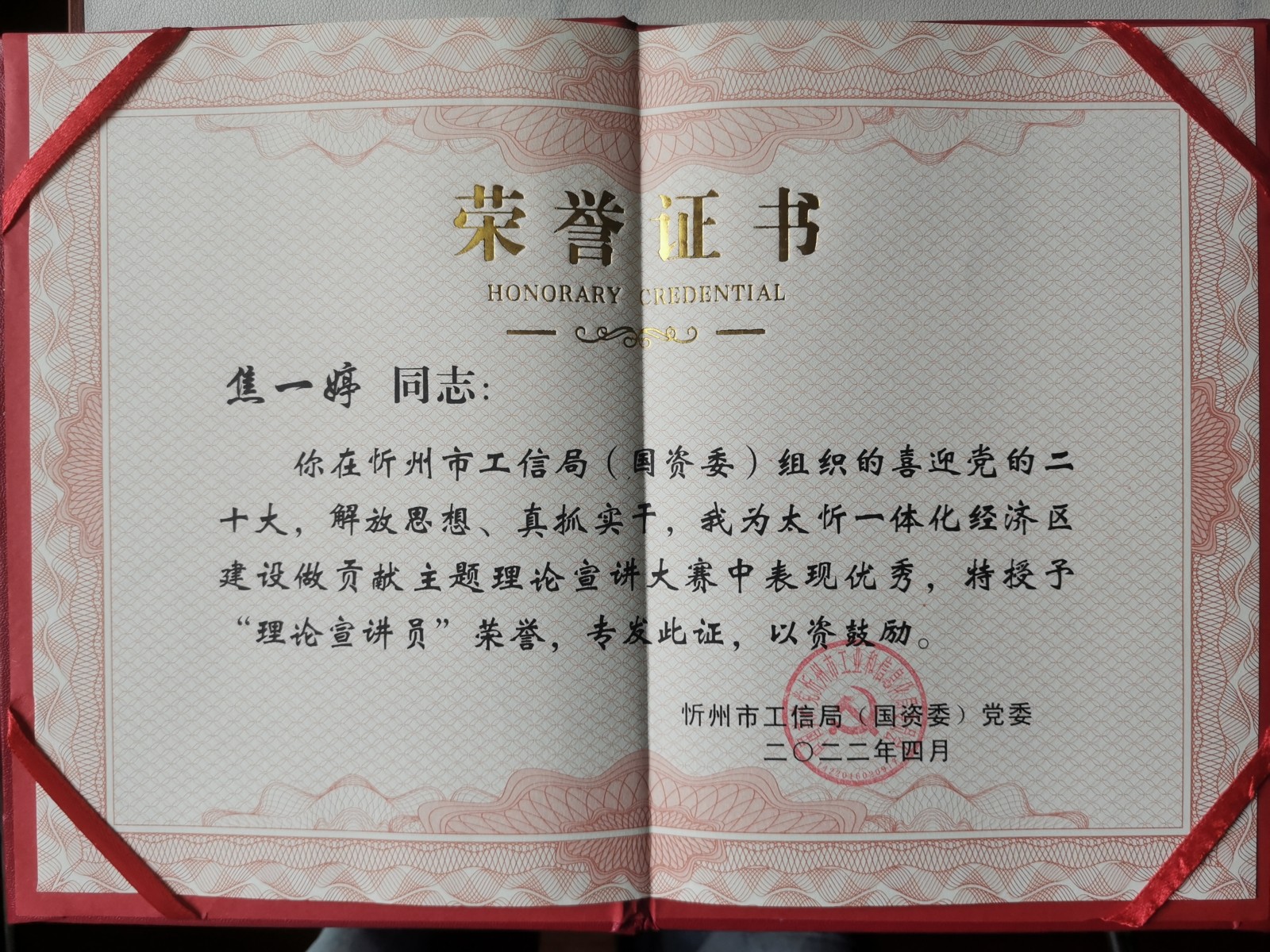 3月21日,以喜迎黨的二十大,解放思想、真抓實(shí)干,我為太忻一體化經(jīng)濟(jì)區(qū)建設(shè)做貢獻(xiàn)為主題的“忻州市第二屆理論宣講大賽”中,我公司參賽人員焦一婷緊扣演講主題,以“忻州市創(chuàng)建文明城市”為抓手,充分結(jié)合自己在創(chuàng)建文明城市中的所做、所見、所聞,就作為一名國(guó)企員工如何在工作中解放思想,真抓實(shí)干展開演講,用實(shí)實(shí)在在發(fā)生在身邊的志愿實(shí)例說(shuō)明問(wèn)題,通俗易懂,極富感染力。大賽組委會(huì)結(jié)合當(dāng)前省內(nèi)疫情防控實(shí)際,開展線下比賽組織參賽選手以錄制視頻的形式參賽,最終經(jīng)過(guò)忻州市工信局(國(guó)資委)黨委的評(píng)比,參賽人員焦一婷榮獲“理論宣講員”稱號(hào),并獲得獎(jiǎng)品《人世間》、《創(chuàng)業(yè)史》書籍兩套。