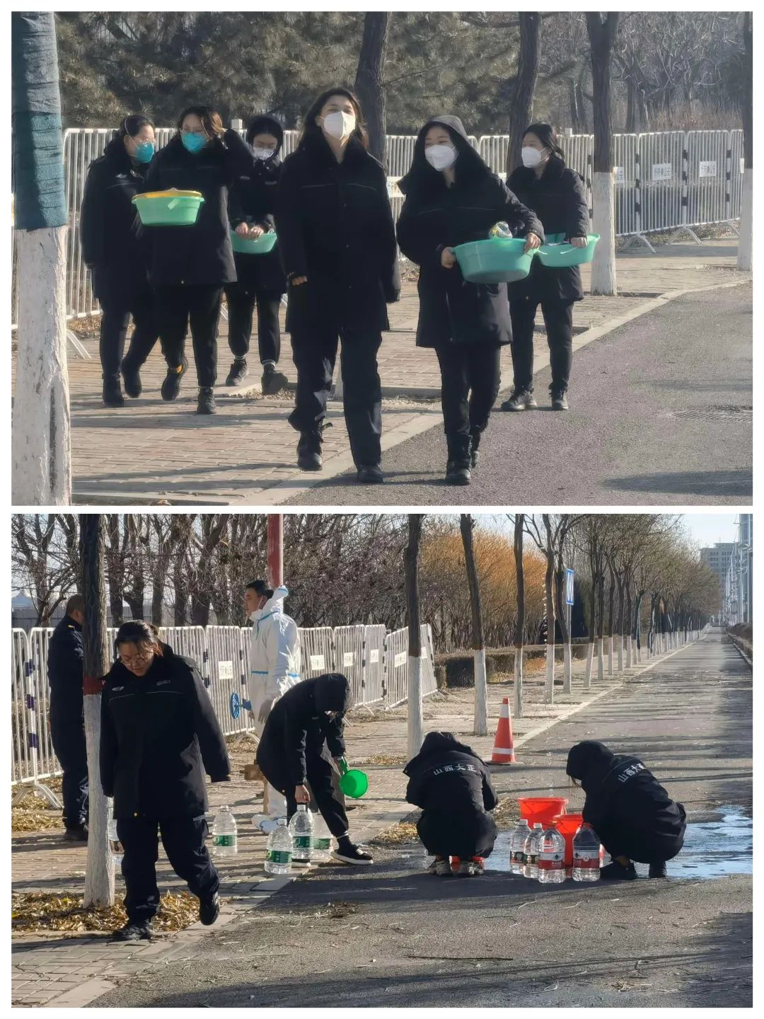 來自監(jiān)控中心的兩名男隊員張航、靳龍宇主動承擔起了每次鉆到下水井放水的任務,每到這個時候,女孩子們提著水桶、礦泉水瓶聚在消防水管下,不管水滴濺到身上還是臉上,搓著手跺著腳卻笑呵呵的打鬧著嬉戲著,緩解著疲憊,釋放著壓力……
