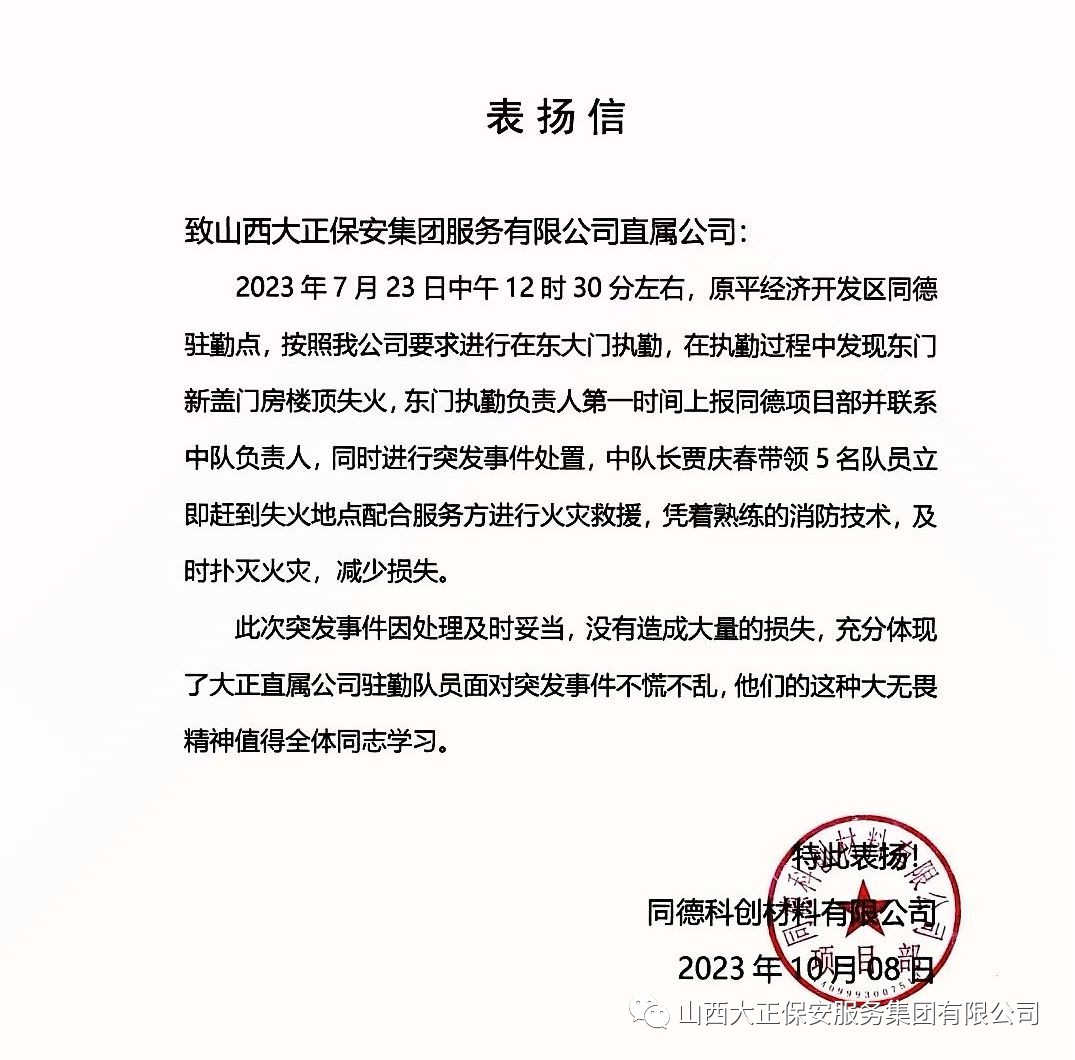 2023年10月8日,山西大正保安服務集團有限公司收到一封來自原平經開區(qū)同德科創(chuàng)材料有限公司的表揚信,對原平經開區(qū)同德對駐勤點全體隊員的工作提出表揚。
