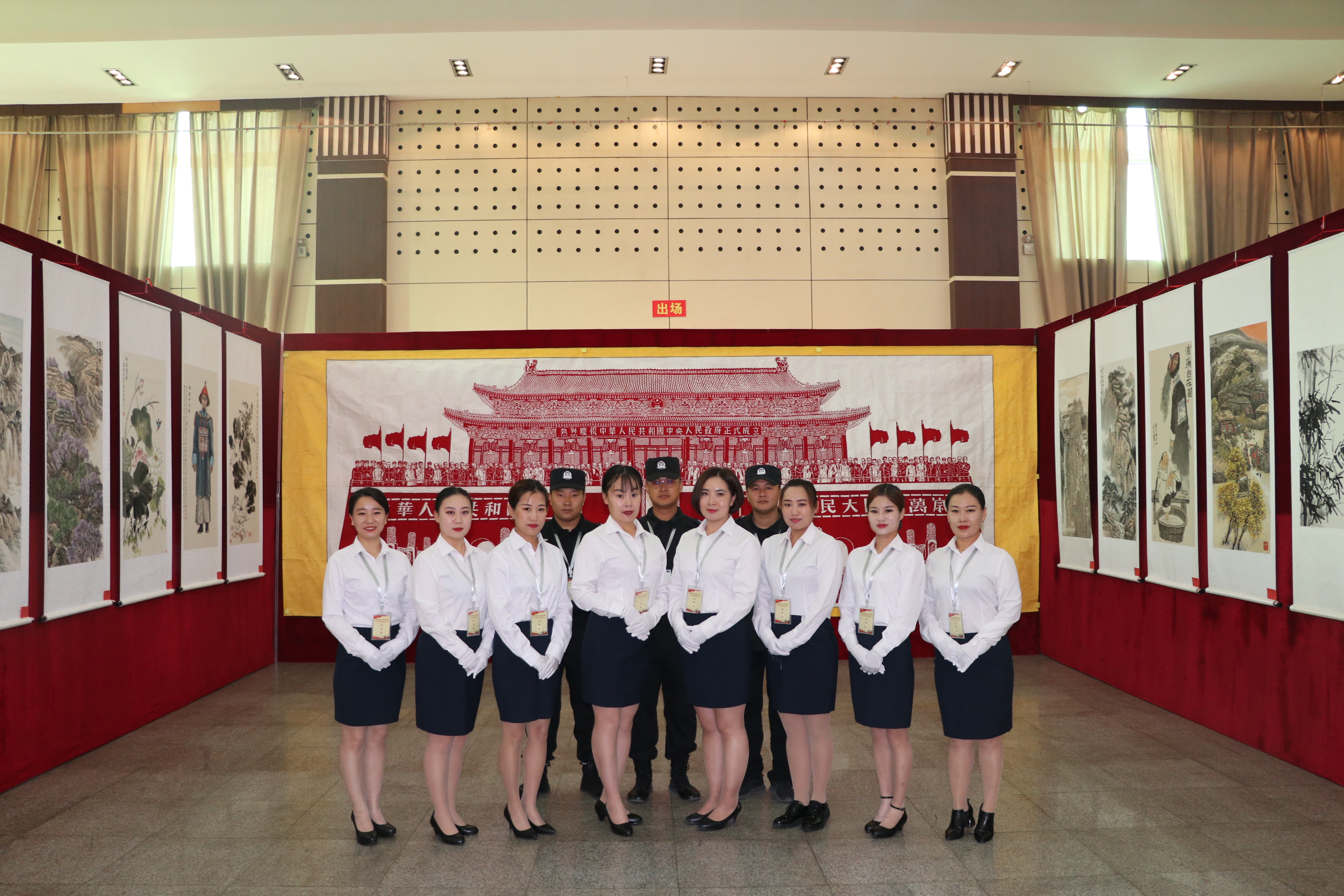 此次巡展意義非凡,文化藝術(shù)公司更是嚴(yán)陣以待。9月19號到黨校進(jìn)行為期4天的會場布置,在男隊員外出勤務(wù),隊里沒有男隊員的情況下,女隊員們充當(dāng)搬卸工,實木的桌椅又大又沉,女隊員們喊著號子,堅持著硬是搬了200余張桌子,千余把椅子,四天里搬桌椅協(xié)助男隊員搭桁架,掛展出的作品,隨處都有女隊員的身影。巡展現(xiàn)場,8名女隊員負(fù)責(zé)禮儀引導(dǎo),微笑服務(wù),在場的領(lǐng)導(dǎo)紛紛為我們的女隊員豎起大拇指。